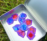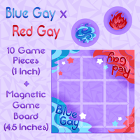 This little game board is composed of a 4.5 x 3.35 x .85 inch hinged tin with a decal on top and a set of 10 cut magnets inside! Meant to be a little versus between the Blue Gays and the Red Gays, with pieces that have classic motifs for blue and red ships!