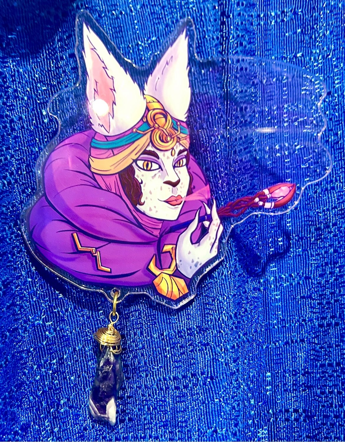 This acrylic pin is made with pink translucent acrylic, is 4 inches, and comes with an amethyst crystal hanging from the bottom as an accent piece!